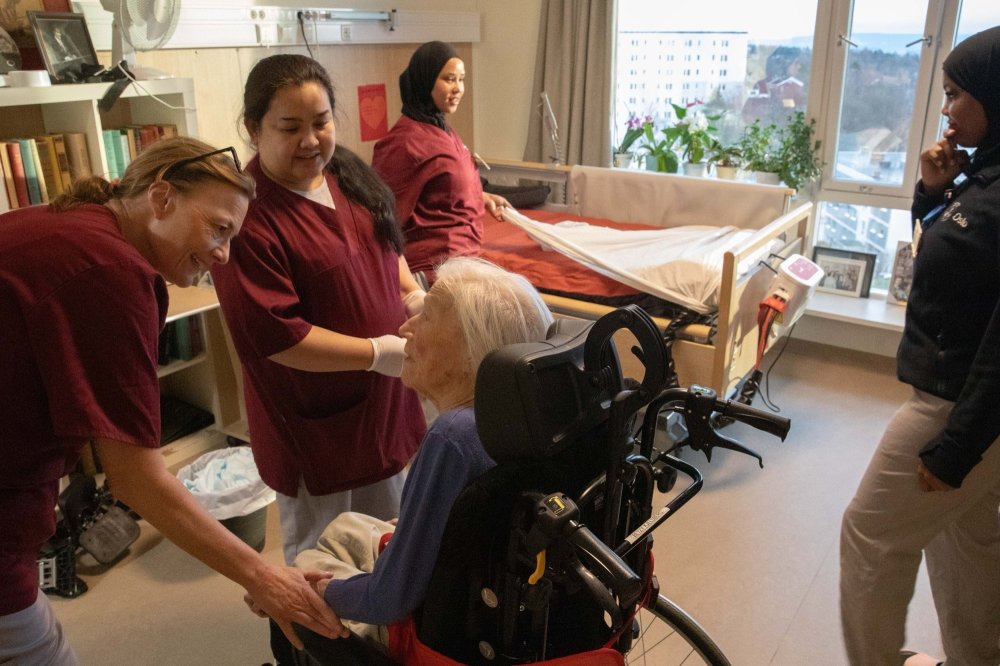Trener pasientsikkerhet med VRDet er uvanlig aktivitet i hagestuen på Nordberghjemmet denne januardagen. Sykepleierstudenter fra VIDs bachelorprogram og helsepersonell ved sykehjemmet er samlet, alle iført VR-briller.