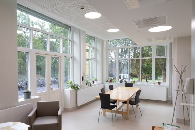 Innenfor veggene i sykehusets moderniserte eldste bygning, er det nå gulvvarme og balansert ventilasjon individuelt styrt for hvert rom. Her prøves det nå også ut, for første gang i en hel alderspsykiatrisk sykehusavdeling, terapeutisk belysning. Lyset skifter farge og styrke automatisk for at pasientene skal hjelpes til en naturlig døgnrytme. Det bidrar til energi og ro for både pasienter og personale avhengig av tidspunkt på døgnet. Erfaringen så langt er positiv.