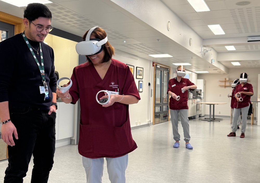 Trener pasientsikkerhet med VRDet er uvanlig aktivitet i hagestuen på Nordberghjemmet denne januardagen. Sykepleierstudenter fra VIDs bachelorprogram og helsepersonell ved sykehjemmet er samlet, alle iført VR-briller.